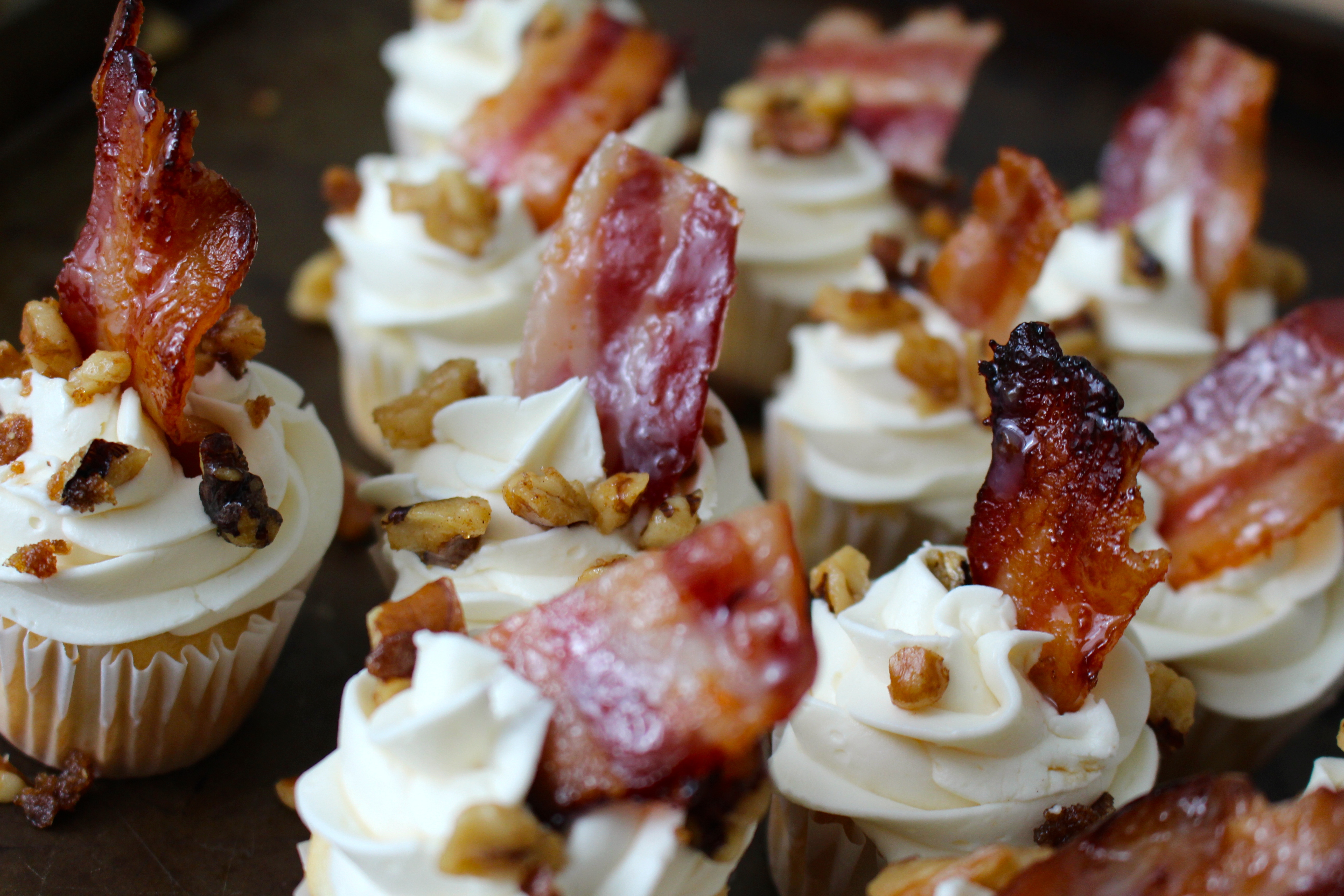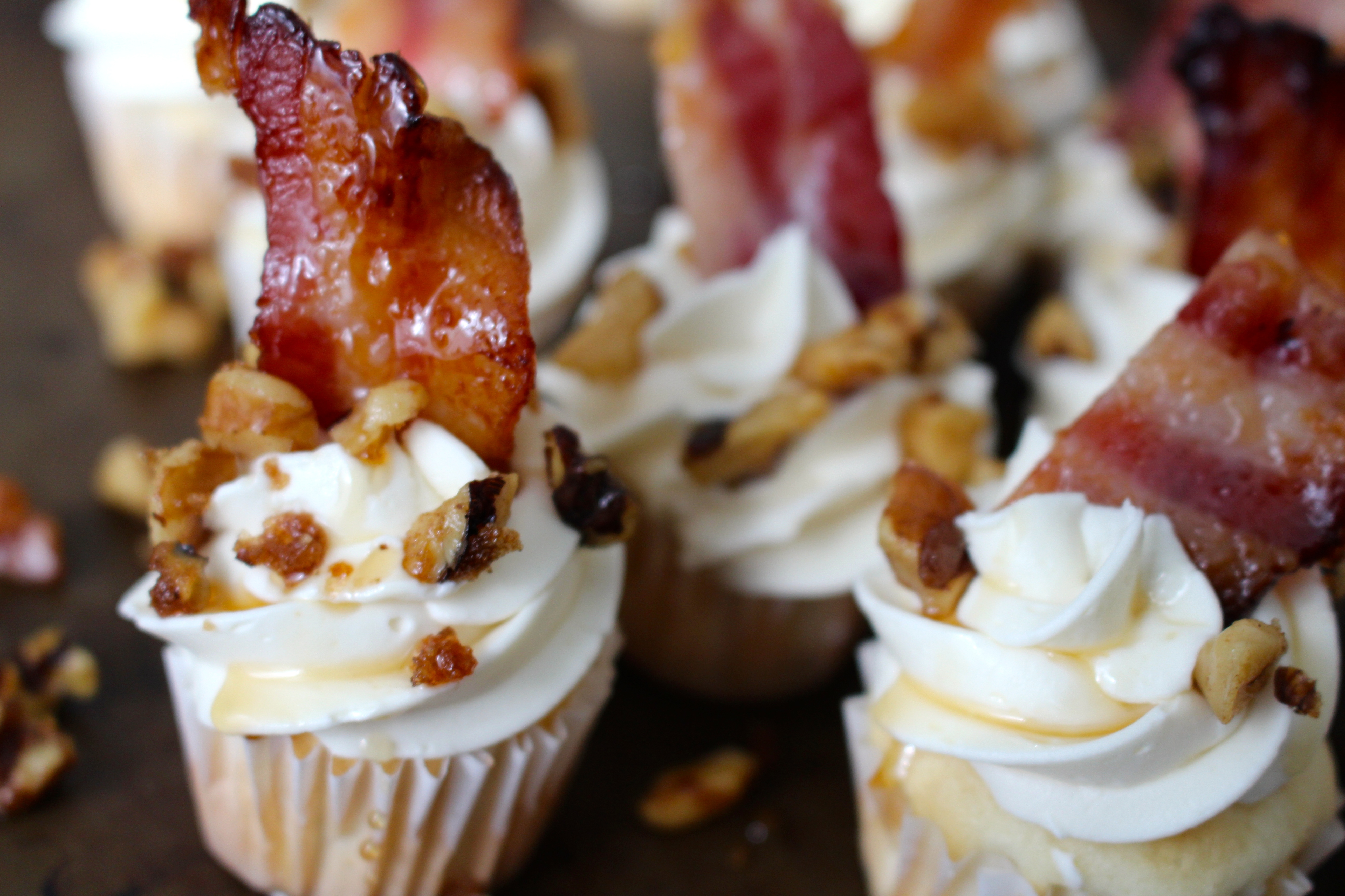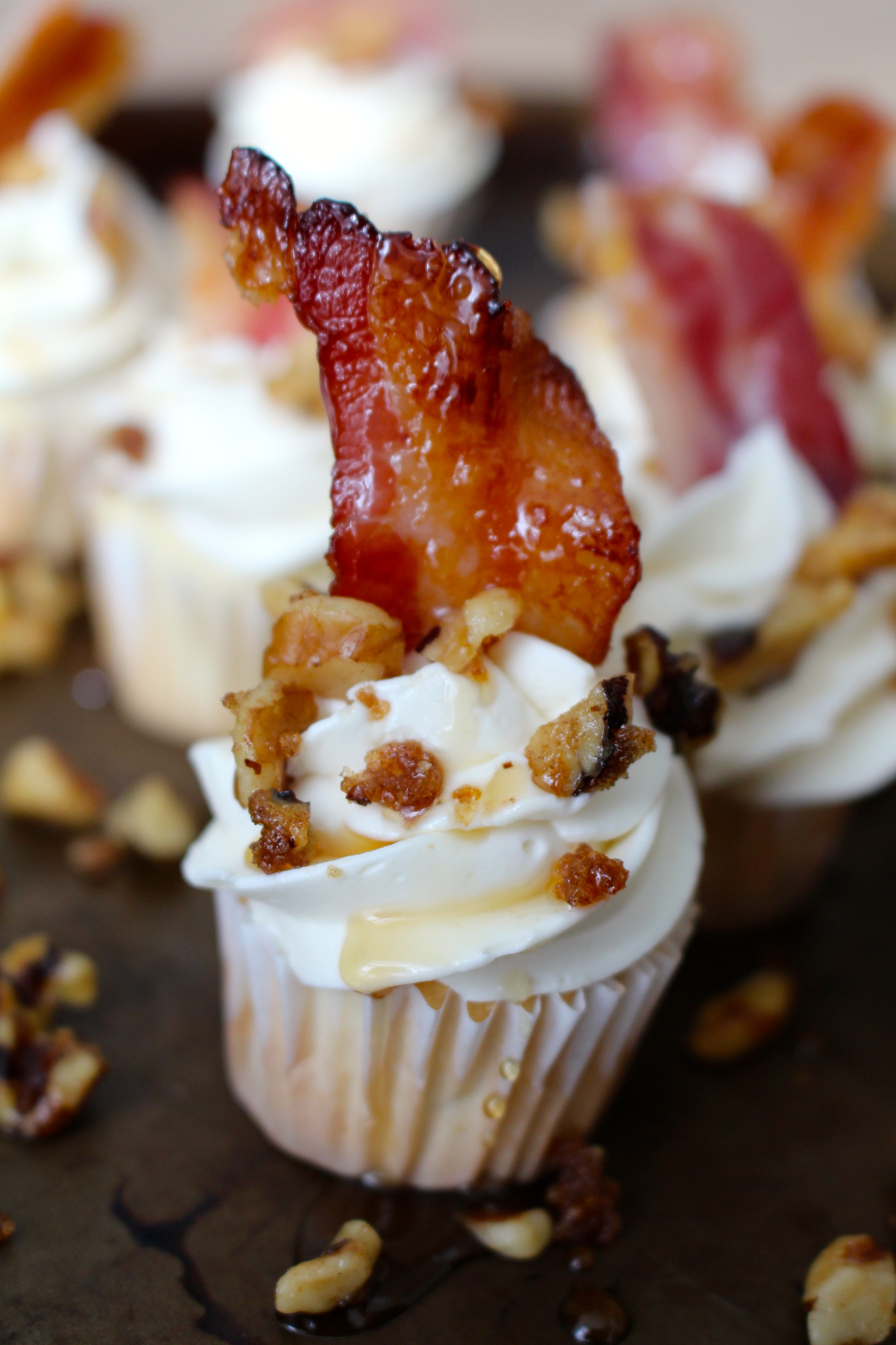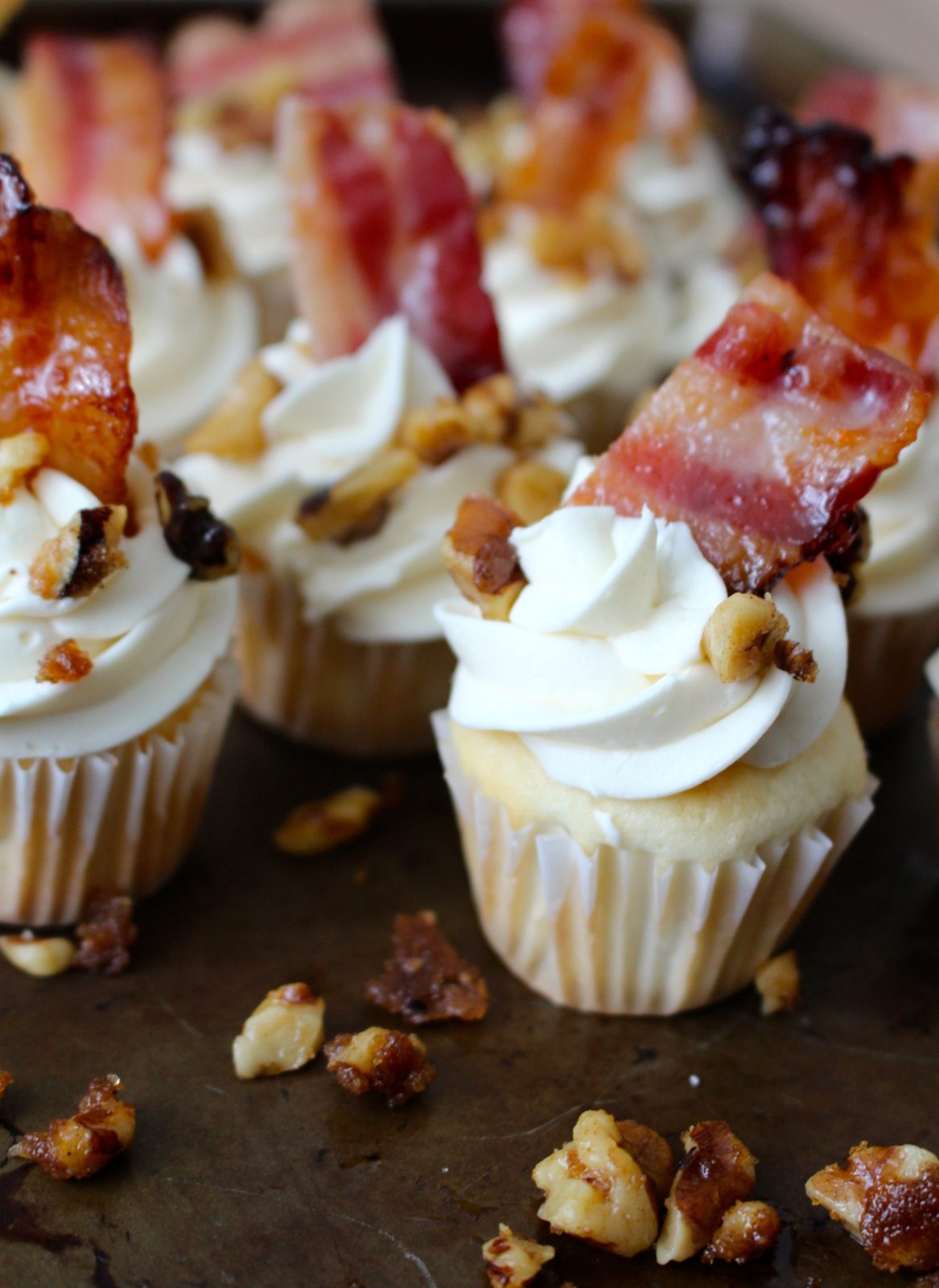 Whether you love breakfast or dinner or bacon on dessert or not, there’s one that’s for sure: Everything is better with bacon. Since these miniature cupcakes are ever so sinful, they had to be made in bite sized portions. A cupcake filled with the flavors of vanilla and maple is topped with a maple buttercream, candied walnuts, and a crispy piece of maple bacon. Let’s just say… It’s a little bite of heaven. One bite and you’ll taste the flavor you get when bacon mingles with syrup while eating pancakes. It’s a wonderful salty-sweet combination you won’t want to miss.