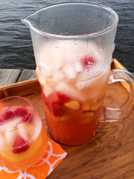 1. Combine first 5 ingredients in a pitcher; stir until sugar is dissolved. Stir in peaches and raspberries. Cover and chill 8 hours.